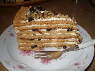 Учла комментарий Вишенки по поводу сладости торта и увеличила количество чернослива. Так как коржи получились толстыми, смазала их смесью сливочного ликера и сливок. Ждала пока впитается в каждый корж, а только потом намазывала кремом. Верхний корж и бока не обмазывала, а сверху положила деревянную доску и поставила груз (кастрюлю с 5 л. воды) на 1 час. Затем обмазала кремом верх и бока, оставила пропитываться при комнатной температуре с 3 часов дня до 12 ночи. После чего убрала в холодильник. Это один из тех рецептов медовиков, которые перед употреблением надо подержать вне холодильника какое-то время. Холодными они становятся твердыми, но, постояв в тепле, приобретают мягкость и нежность. Возможно, у меня он такой получился из-за крема. Торт понравился абсолютно всем, особенно виновнику торжества. Не приторно сладкий, не сухой (конечно, не дающие во рту лакомство), очень большой (d26см.,h 7 см.). Очень вкусно!!! Вера, СПАСИБО!