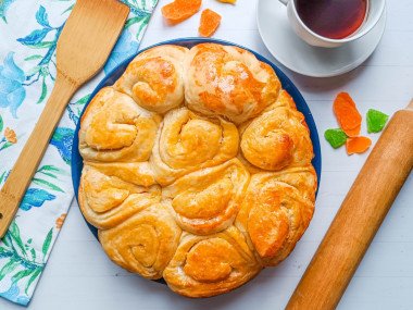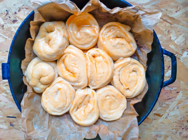 Булочки (у меня получилось 10 штук) выпекала в чугунной сковороде (дно застелила пергаментом) при 180 градусах 30 минут. Получился настоящий пирог из булочек, красивый и ароматный. Булочки очень нежные, мягкие как пух. Они в меру сладкие с приятным сливочным вкусом.