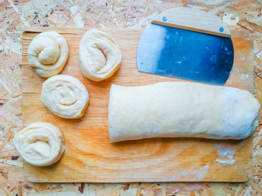 Сверните тесто плотным рулетом. Можете разделить тесто на 2 части и сделать 2 рулета. В таком случае булочки будут более мелкими.