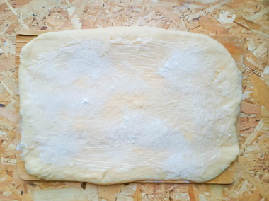 Подошедшее тесто обомните и раскатайте на присыпанном мукой столе в прямоугольный пласт. Смажьте поверхность теста растопленным сливочным маслом и присыпьте сахаром. По желанию можете посыпать еще молотой корицей.