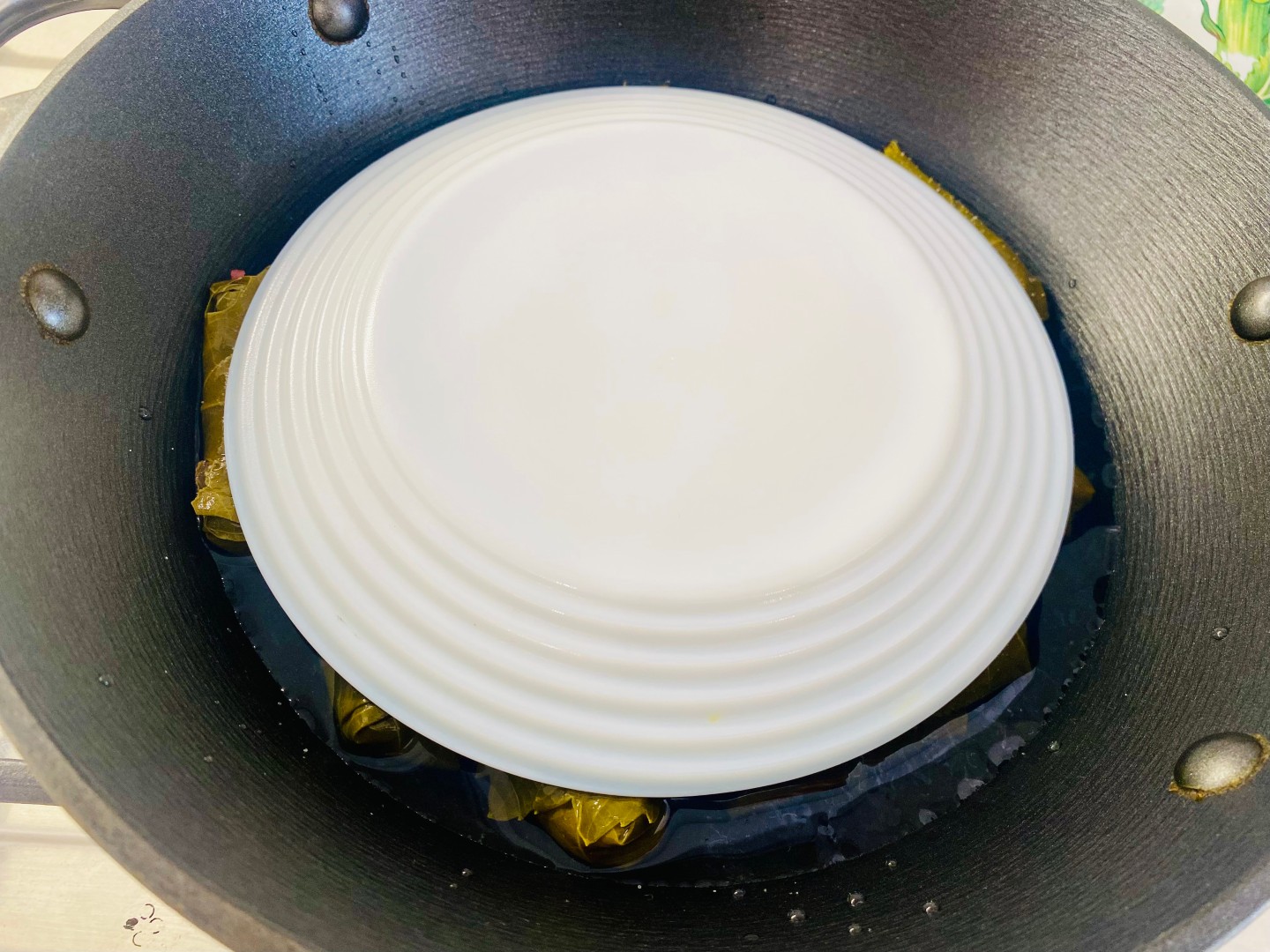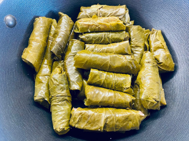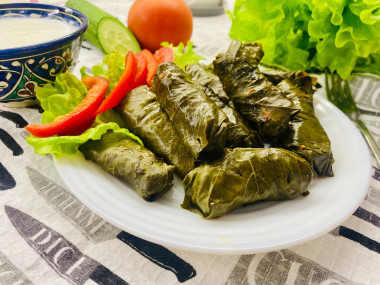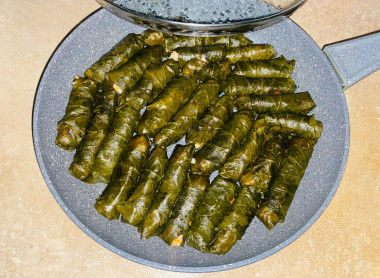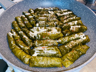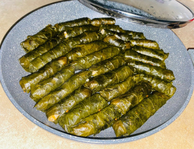 У меня готовые виноградные листья, замачиваю в кипятке на 5 минут, а если листья свежие, их нужно поварить минуты 2, до изменения цвета, в обоих случаях блюдо готовиться всего 40-50 минут на медленном огне, до испарения воды или готовности риса.