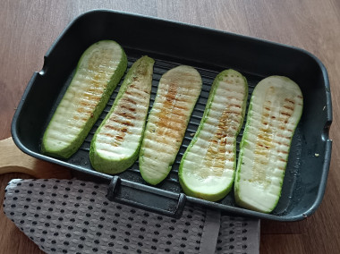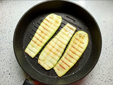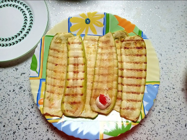Кабачки я хорошо помыла, обсушила и нарезала тонким ножом на пластины. Брала среднюю часть плода, чтобы рулетики получились одинаковыми. Обжаривала пластинки на сковороде - гриль, чтобы появились красивые полосочки, да и масла используется меньше.