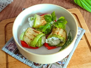 Пластины из кабачка намазала начинкой и скрутила в рулетики. Закуска получилась вкусной.