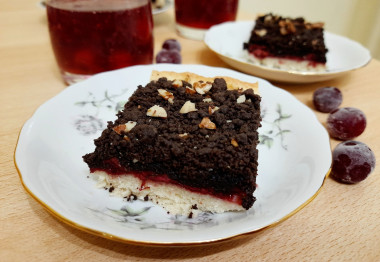 Покрываем вишню шоколадной крошкой. Выпекаем пирог при 180 С около 40-50 минут. Пирогу даем полностью остыть и нарезаем на порционные квадратики.