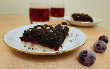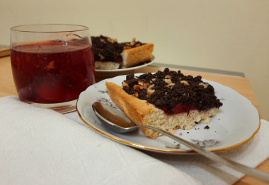 Давно сохранила себе этот рецепт песочных квадратиков с вишней и шоколадной посыпкой. А недавно приготовила! Вишню брала замороженную. Вишню хорошо отжала, боялась, что при выпечке будет много сока. В итоге, вишни у меня получилось меньше, чем указано в рецепте. При приготовлении теста блендером не пользовалась, делала всё вручную. Орехов тоже взяла немного меньше, сколько было в наличии, поэтому при приготовлении шоколадной крошки пришлось добавить ещё немного муки, чтобы крошка получилась. На всякий случай из теста сделала дополнительно бортики. Пирог получился очень вкусный, мягкий, с вишнёвым ароматом и шоколадными нотками! Отличное сочетание вишни с шоколадной крошкой! На будущее, надо брать больше замороженной вишни, так как у меня осталось много сока. Но сок не пропал, я сварила вишнёвый кисель