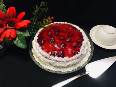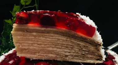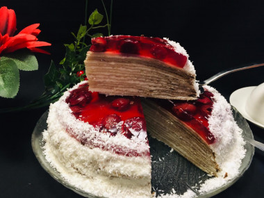 .Тортик у меня из 16 блинчиков.которые я промазывала творожным кремом.чередуя с вишнёвым джемом.Верх торта выложила вишней и залила желе.Когда желе застыло.бока тортика промазала оставшимся кремом и посыпала кокосовой стружкой.Получилось безумно вкусно!Спасибо за рецепт!
