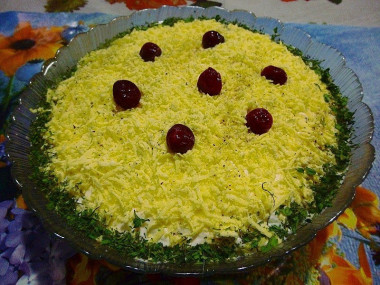 Последним слоем распределите тертые желтки. Поставьте салат на 30 минут в холодильник для пропитки.