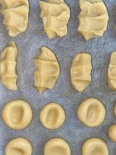 Тесто можно отсадить печеньками с помощью кондитерского мешка с насадкой. Здесь не подойдет тонкий одноразовый мешок - тесто его порвет. Мешок берите силиконовый. Так же тесто можно раскатать и вырезать любую форму, воспользовавшись формочками для печенья или перевернутым стаканом. Противень застелите пергаментом для выпечки и разложите на него вырезанное печенье. Все о выборе пергамента читайте в статье по ссылке в конце рецепта.