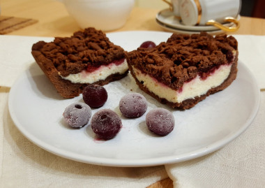 Пирог мне очень понравился! Тесто готовится просто, с ним легко и хорошо работать. Тесто готовила без использования блендера, все перетирала вручную, нормально и не долго получается. Для начинки использовала хороший домашний творог и предварительно размороженную вишню. Очень вкусный пирог получился! Шоколадное тесто, сладкий творог и немного кисловатая вишня - просто идеальное сочетание