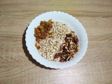 Смешиваем овсяные хлопья (они не должны быть быстрого приготовления, обычная овсянка) и ваши сухофрукты/орехи/семечки/кокосовая стружка и т.д. и т.п. всё что нравится вам и вашим домашним, с пропорциями так же можно варьировать)
