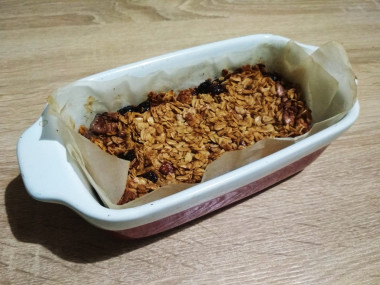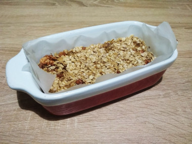 Форму застилаем пекарской бумагой и выкладываем вашу гранолу в форму (главное не менее 2 см. в толщину,иначе раскрошиться,и не толще 4 см. т.к. не пропечётся)