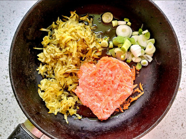 В это время сделайте зажарку. Морковку очистите. Ополосните лук порей и морковь под проточной холодной водой. Вместо порея можно использовать обычный репчатый лук. Нарежьте морковку и лук удобным для вас способом. В сковороде разогрейте оставшееся растительное масло и обжарьте лук с морковкой несколько минут помешивая.