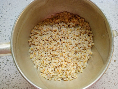 А в это время перловую крупу ополосните, а затем залейте холодной водой . Оставьте таким образом на 1,5-2 часа, чтобы крупа разбухла.