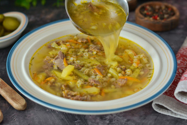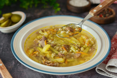 Калорийность продуктов: Говядина, Морковь, Вода, Картошка, Перловка, Лук-порей, Соль, Специи сухие, Соленые огурцы