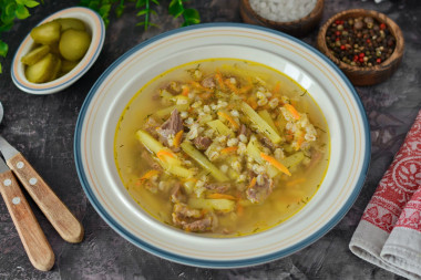 Рассольник хоть и считается "зимним" супом, но я его готовлю с мясом и перловкой круглый год. На этот раз выбрала рецепт "Рассольник Ленинградский". Варила суп тоже из говядины, но у меня было мясо на кости. Поэтому сначала отварила его до готовности, а затем отделила от кости и нарезала кусочками. Одновременно отварила замоченную перловку. Огурцы и морковь натёрла на крупной тёрке, хоть дочка и любит рассольник, но овощи должны быть хорошо измельчены) Очень хотелось бы попробовать лук-порей, но у нас его не так то просто найти. Решила заменить репчатый лук на белые стебли молодого лука, они тоже небольшими колечками получились) Вкус в любом случае мягче. Рассола взяла пол стакана на два литра воды, нам этого вполне хватило. Из специй добавила немного копченой паприки, смесь перцев и сушеный укроп. Получился наваристый, сытный рассольник с пряными нотками. Очень вкусно!