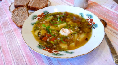 Рассольник очень вкусен со сметаной и с корочкой чёрного хлеба.