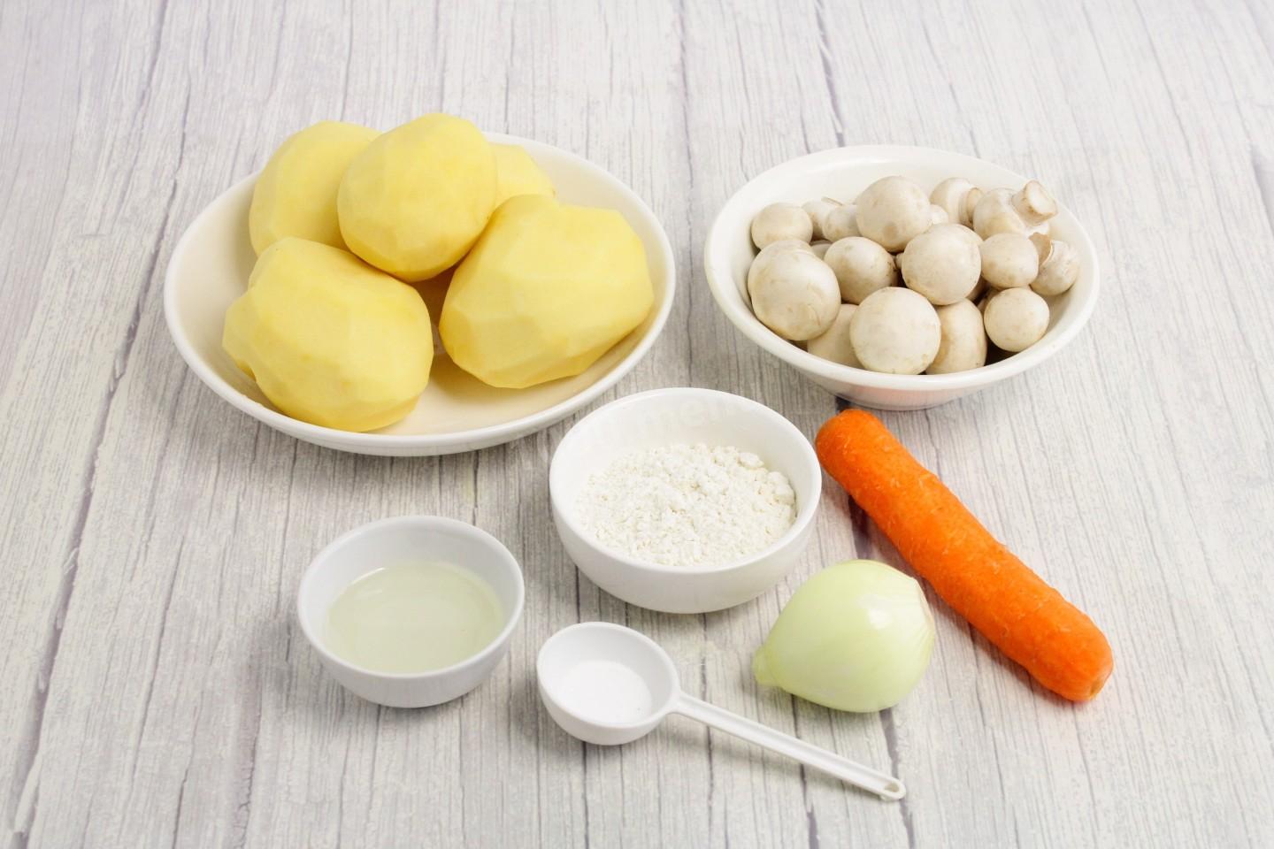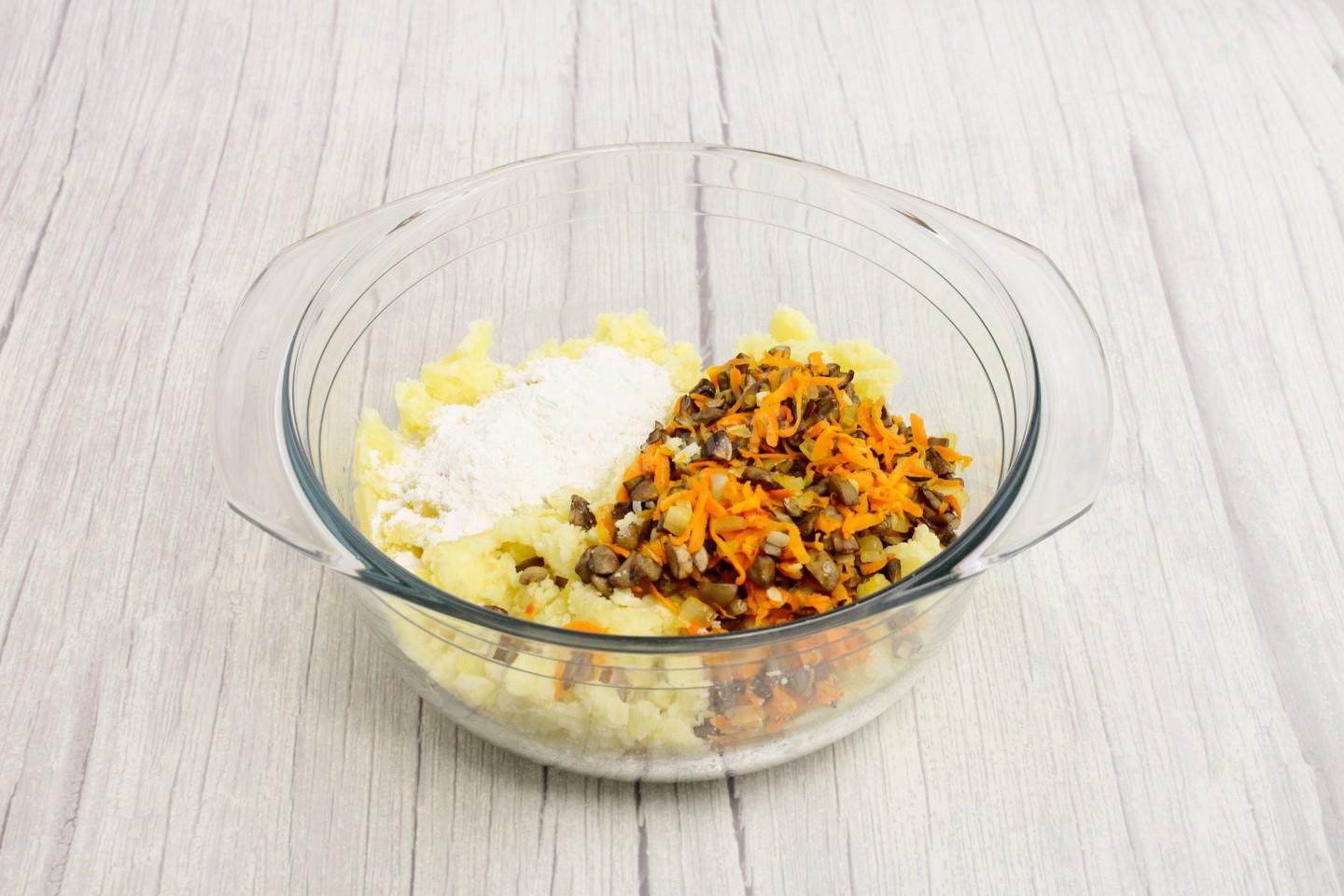 Картофельную массу соедините с обжаренными грибами и овощами, добавьте муку, оставив немного для панировки. Муки может уйти чуть больше или меньше в зависимости от ее свойств. Хорошо перемешайте. Мука выполнит роль связующего компонента в постной картофельной массе. Дайте массе постоять 10-15 минут, чтобы мука набухла, клейковина расслабилась и масса стала более вязкой. О свойствах муки читайте в статье в конце рецепта.