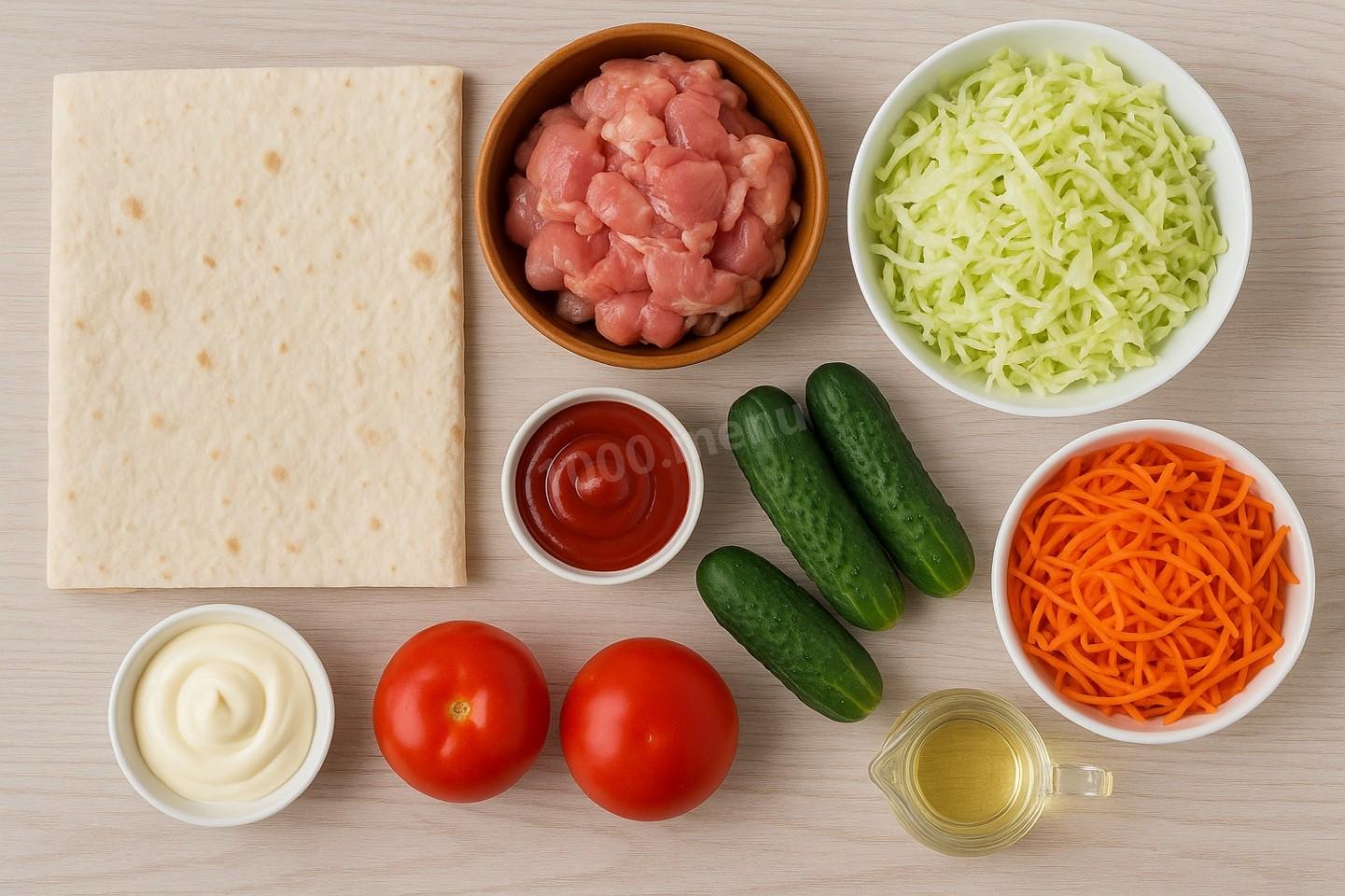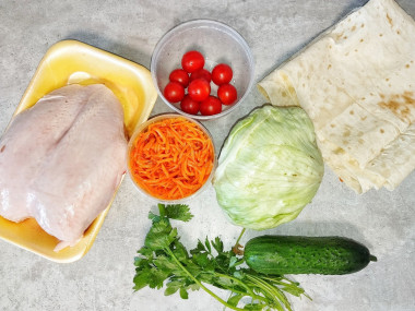 Как сделать шаурму с курицей и корейской морковью? Подготовьте ингредиенты. Овощи тщательно вымойте. С курицы срежьте мякоть. Подробнее о том, как подобрать подходящую часть курицы, правильно ее разморозить и вкусно приготовить, читайте по ссылкам под шагами.
