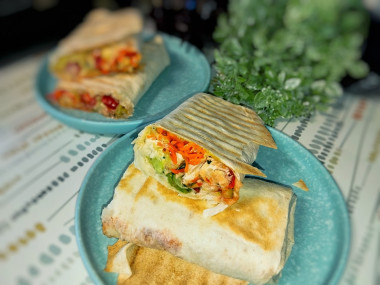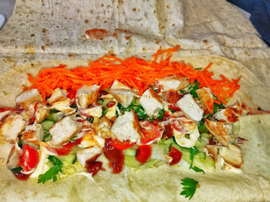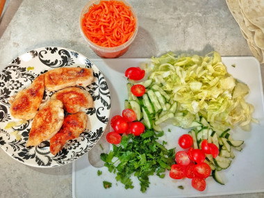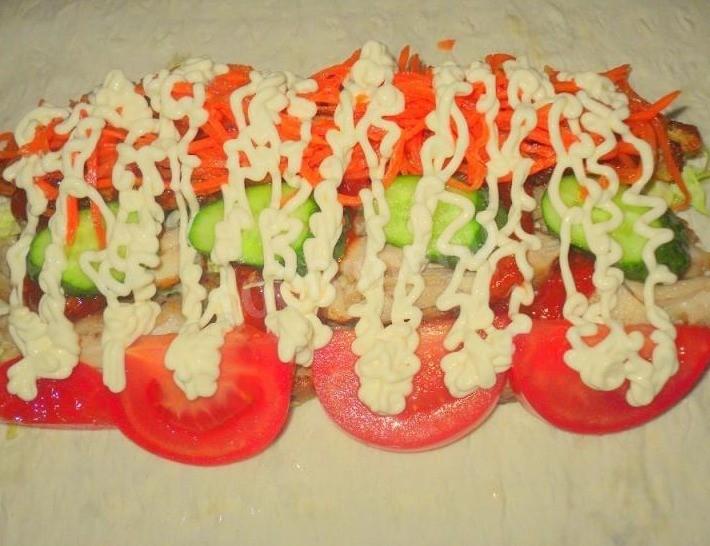 На тонкий армянский лаваш выложите капусту, а поверх нее - жареную мякоть курицы (3 ложки на 1 порцию). Все полейте кетчупом. Далее положите кружочки помидора и огурца, а сверху выложите корейскую морковь и полейте майонезом. Для более легкого варианта можете заменить майонез на греческий йогурт или приготовить его самостоятельно. Подробнее - по ссылке ниже. Заверните в рулет. Рулет с 2-х сторон обжарьте на разогретой сухой сковородке или гриле.