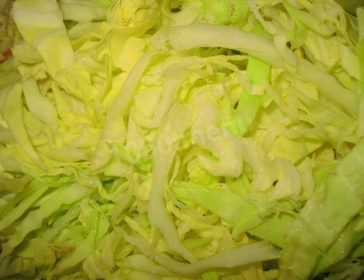 Нашинкуйте белокочанную капусту и слегка помните ее руками, чтобы выделился сок.