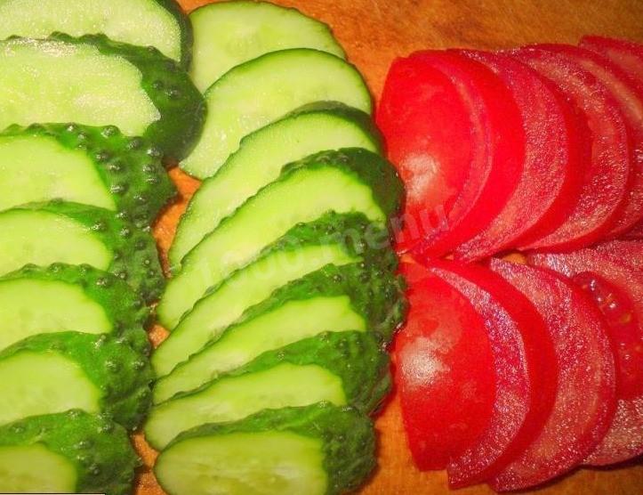 Помидор и огурец нарежьте кружками.