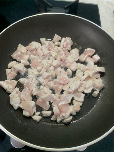 1. Куриное филе нарезать средними кубиками. В сковороду налить водички (около стакана), добавить майонез и выложить кусочки куриного филе. Посолить. Тушить под крышкой 30 мин. Добавить нарезанный чеснок. Начинка для тарталеток готова.
