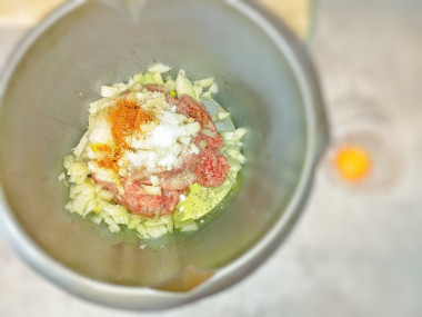 В фарш добавьте немного соли и специи по вкусу. Какие специи выбрать под ваш фарш читайте в статье по ссылке в конце рецепта. Всю массу хорошо перемешайте.