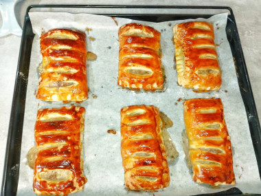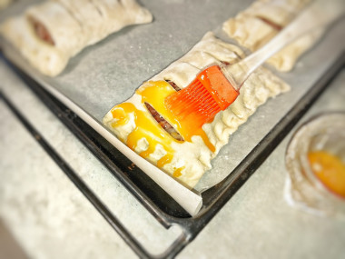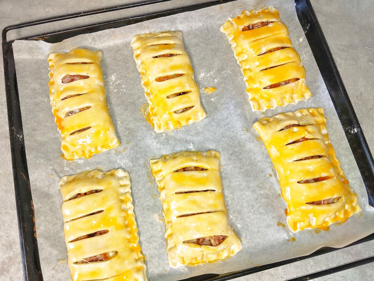 Слоеные пирожки выложите на противень для выпечки, застеленный пекарской бумагой. Какую бумагу лучше выбрать читайте в статье по ссылке в конце рецепта. Верх каждого пирожка смажьте желтком. Это необходимо, чтобы они подрумянились. Поставьте противень в духовку, разогретую до 180 градусов, примерно на 30-35 минут. Время указано приблизительно, ориентируйтесь на свою духовку. Полезную информацию о духовках читайте в статье по ссылке в конце рецепта.