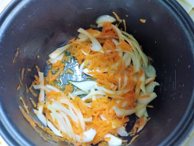 Морковь натрем на средней терке, выкладываем наши овощи в чашу мультиварки, перемешали и минут 5 жарим.