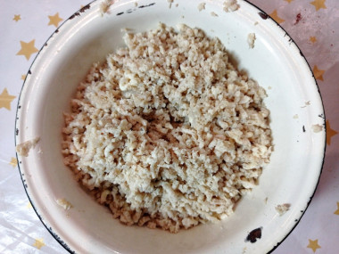 Фарш я сделала из говяжьего рубца. Предварительно я отварила трижды его по 10 минут, после чего сливала воду. На четвёртый раз рубец варился около 1,5 часов. Охлажденный рубец я пропустила через мясорубку. Фарша у меня получилось около 800 граммов.