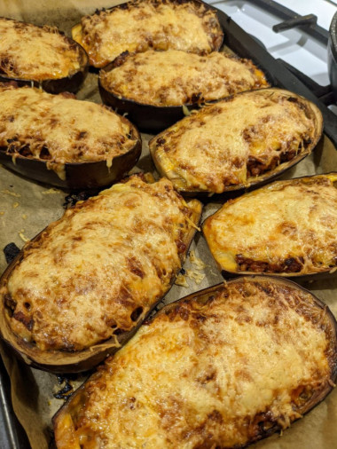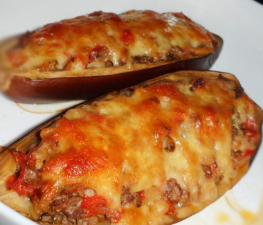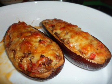 Баклажаны лодочки фаршированные с фаршем запеченные в духовке хороший вариант для легкого ужина. Количество ингредиентов поделила на два. Половинки баклажана замачивала в кастрюле для варки на пару. Чтобы они не всплывали, сверху придавила их вставкой-пароваркой - очень удобно. Пропорции в рецепте удачные. Начинки как раз хватило, чтобы наполнить лодочки до краев. Баклажаны с начинкой присыпала сыром сверху сразу. Через полчаса после начала запекания сыр начал румяниться, но лодочки были ещё не готовы, поэтому форму прикрыла фольгой и запекала ещё 15 минут. Сытные, ароматные и сочные баклажаны можно приготовить и на праздничный стол. Спасибо большое за рецепт!