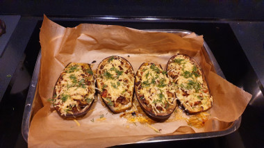 - запечь фаршированные баклажаны с начинкой, но не посыпая сыром, минут 50 - 60, а затем посыпать натёртым сыром и запечь уже с ним до образования румяной корочки.