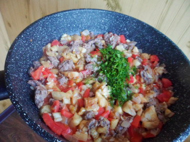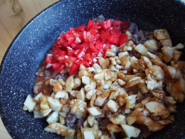 Добавить к фаршу нарезанную мякоть баклажана и нарезанный помидор. Обжаривать всё вместе до выпаривания жидкости. Добавить соль и перец по вкусу.