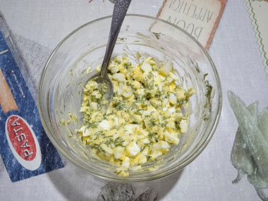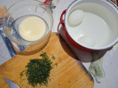 Яйца вымойте в проточной воде, отварите вкрутую, охладите и очистите от скорлупы. Нарежьте мелкими кубиками. Чем ярче будут желтки, тем красивее получится соус.