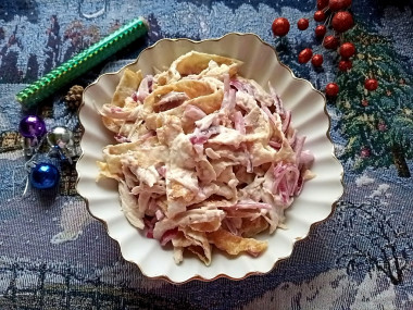 Очень вкусный салатик! Сочный, нежный и сытный. Приятно хрустит маринованный лук, к тому же он придает интересную кислинку. Мужу и сыну тоже понравился этот салат, возьму рецепт на заметку.