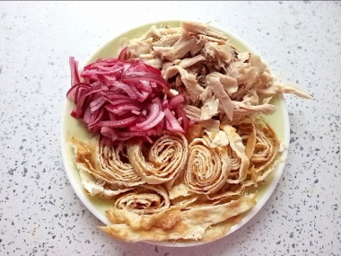 Приготовила салат императорский. Отварила куриную грудку, поджарила яичные блинчики ( это быстро и легко, блинчики легко переворачиваются), замариновала нарезанный репчатый лук. Когда все ингредиенты остыли, нарезала их, уложила слоями с помощью импровизированного салатного кольца из пластиковой бутылки. Верхний слой из яичных блинчиков по совету автора майонезом не промазывала . Такой вариант подойдёт, если салат будете подавать непосредственно после приготовления, в противном случае можно нанести майонезную сеточку, чтобы верх салата не заветривался. Очень сытный и вкусный салат, добавление маринованного лука придает ему приятную остринку- кислинку, сочность и нежное похрустывание. Попробуйте обязательно! Спасибо автору за рецепт!
