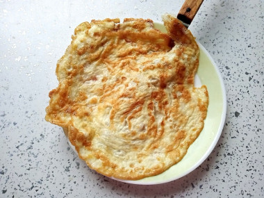 Из получившейся яичной смеси выпекаем два тонких блина. Блины пекутся очень быстро: не более минуты с первой стороны и секунд 30 со второй.
