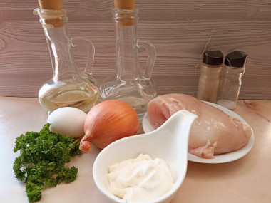 Для приготовления Императорского салата необходимы следующие ингредиенты: куриные грудки, лук, яйца, майонез, сахар, подсолнечное масло, поваренная соль, уксус, а для украшения - свежая зелень петрушки.