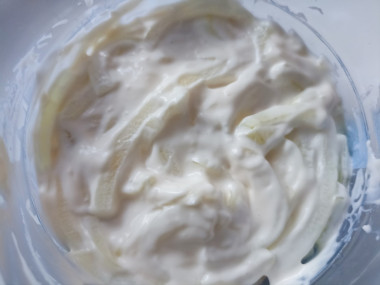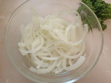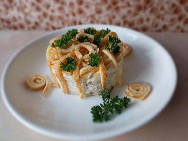 Вторым слоем положим маринованный полукольцами лук. Сверху лук смазываем майонезом.