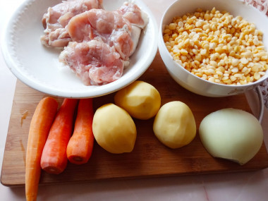 К обеду решила приготовить гороховый суп с курицей в мультиварке. Горох я предварительно замачивала на ночь. Лук и морковь я слегка обжарила. В мультиварку загрузила одновременно кусочки курицы и горох, тушила вместе час, после этого добавила нарезанный кубиком картофель и обжаренные овощи. Всё вместе тушила ещё час. Если вы любите, чтобы горох в супе сохранил форму- возможно часа приготовления хватит, но мы любим разваренный горох, поэтому время приготовления я увеличила вдвое ( несмотря на то, что горох предварительно замачивала) . Скорее всего у автора мультиварка - скороварка, поэтому ориентируйтесь на свою помощницу))) У меня - обычная мультиварка. При подаче добавила зелень укропа. Вкусный, диетический вариант ( без копченостей) горохового супа получился, спасибо, ArinaA!