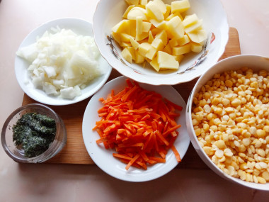 Все закладываем в мультиварку, туда же высыпаем промытый горох и наливаем воду до максимальной отметки