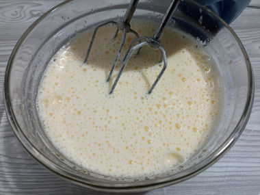 Яйца вбейте в другую миску, объемом побольше. Взбейте их с сахаром до светлой и пышной массы.