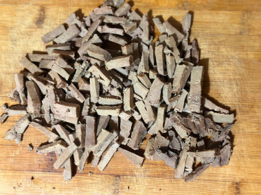 Печень очистите от прожилок и частичек жира, помойте. Отварите печень в кипящей подсоленной воде на умеренном огне до готовности в течение 20 минут. Время указано приблизительно, варите то готовности, но печень должна остаться мягкой, при этом без следов крови (не розовая) внутри). Ориентируйтесь на свою технику и продукты. Воду слейте, печень остудите. Нарежьте печень небольшими брусочками.Шаг 6: