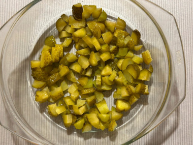 Соленые огурцы нарежьте не слишком тонкими брусочками.Шаг 7:
