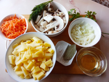 Со шляпок шампиньонов снимите тонкую кожицу, помойте грибы в проточной воде, обсушите. Долго мыть грибы не стоит, так как они впитают много влаги и будут не обжариваться, а тушиться. Порежьте шампиньоны пластинками, добавьте в мультиварку к овощам и обжарьте. Это придаст нашему супу более насыщенный грибной вкус и аромат. Обжаривайте, периодически помешивая минут 10-15.