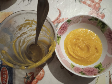 Готовую тыкву переложите в миску и разомните толкушкой для приготовления пюре. Если хотите, чтобы в нем не было кусочков, пробейте все блендером. Попробуйте тыквенную кашу и при желании доведите ее до вкуса сахаром и солью. Если будите подавать ее в горячем виде, можно приправить ее сливочным маслом.