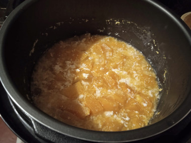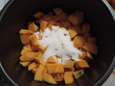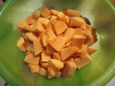 Тыкву разрежьте на кусочки, удалите семечки и срежьте корку. Если кожура очень жесткая, разрежьте тыкву на мелкие части, так легче будет ее удалить. Порежьте очищенную тыкву на кусочки и уложите в чашу мультиварки. Чем мельче порежете, тем сильнее разварится тыква.