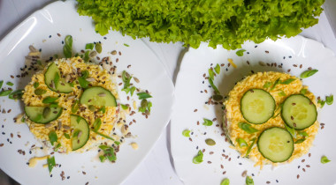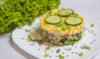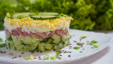 Для салата взяла один гладкий огурец, пару отварных яиц и консервированное филе тунца в собственном соку, чтобы не выбирать рыбные кости из консервы. Огурец промыла, нарезала кубиками, оставила несколько огуречных кружочков для украшения салата. Рыбное филе отделила от жидкости, помяла вилкой на более мелкие кусочки. Яйца отчистила, отделила белки от желтков и натерла на мелкой терке. На блюдо выложила кольцо и стала собирать салат слоями, промазывая каждый слой майонезом. Сверху салат украсила ломтиком огурца, рубленным зеленым луком и семенами.