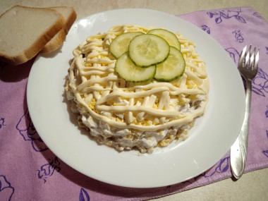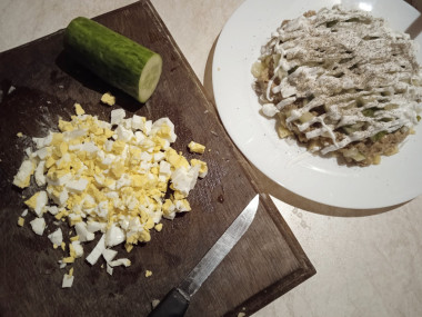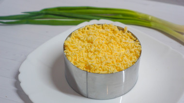 Следующим слоем распределите измельченные белки и промажьте их майонезом. Поверх белков последним слоем натрите на мелкой терке желтки. Салат можно сразу же подавать к столу или поставить в холодильник для пропитки на 1 час.