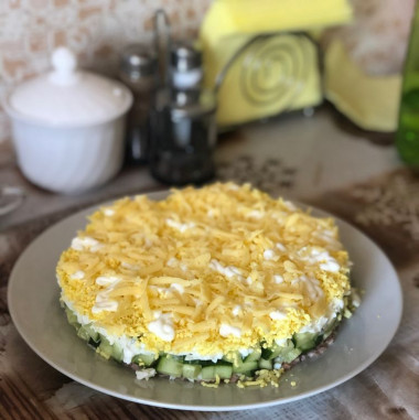 Если вы не планируете подавать салат сразу же, то его нужно аккуратно затянуть пищевой пленкой, стараясь, чтобы пленка не провисала и не касалась тертых желтков (иначе весь слой желтков останется на пищевой пленке). Это убережет салат от заветривания, так как желтки быстро высыхают и темнеют. Перед подачей украсьте салат кружочками огурца и веточками петрушки.